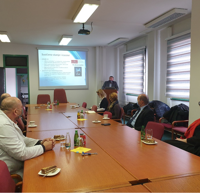 Prof. dr. Muhamed Smajlović, dekan Veterinarskog fakulteta, predstavio je sažetak ključnih postignuća i aktivnosti u dosadašnjem osmomjesečnom mandatu kao i planove za dalja unaprijeđenja. Razgovaralo se i o međunarodnim i naučnoistraživačkim projektima, međunarodnoj saradnji te realizaciji nastave i ispita u oklonostima aktuelne epidemiološke situacije. Delegacija je upoznata o jako dobrom snalaženju nastavnog osoblja Veterinarskog fakulteta sa online režimom nastave, s obzirom da je naš Informatički centar VFS još od 2003. godine uveo e-nastavu na fakultetu putem Moodle platforme.