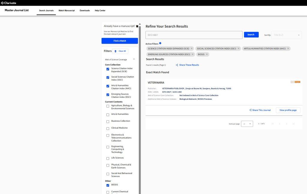 Časopis “VETERINARIA”, čiji je izdavač Univerzitet u Sarajevu – Veterinarski fakultet, nastavlja širiti svoju međunarodnu prepoznatljivost. Uz brojne baze u kojima je već zastupljen, časopis je od sada indeksiran i u prestižnoj bazi Clarivate Web of Science – BIOSIS Previews.