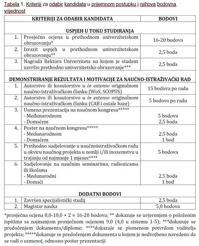 Za doktorski studij „Veterinarska medicina i javno zdravstvo“ ne polaže se prijemni ispit. Selekcija kandidata zasniva se na uspjehu iz prethodnog obrazovanja (minimalna prosječna ocjena osam) te ispunjavanju drugih uslova iz teksta konkursa i elaborate . Ako broj prijavljenih premaši kapacitet, prednost imaju kandidati s većim brojem bodova prema kriterijima iz Pravila studiranja (Tabela 1). Po potrebi, Komisija može organizovati i intervju sa kandidatima.