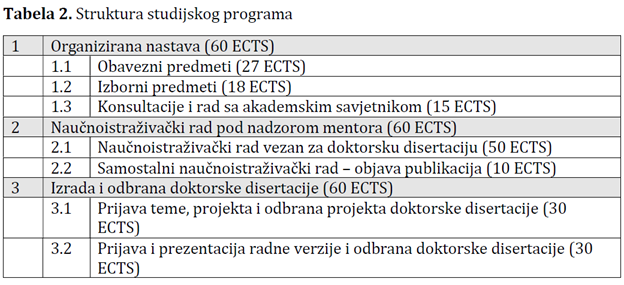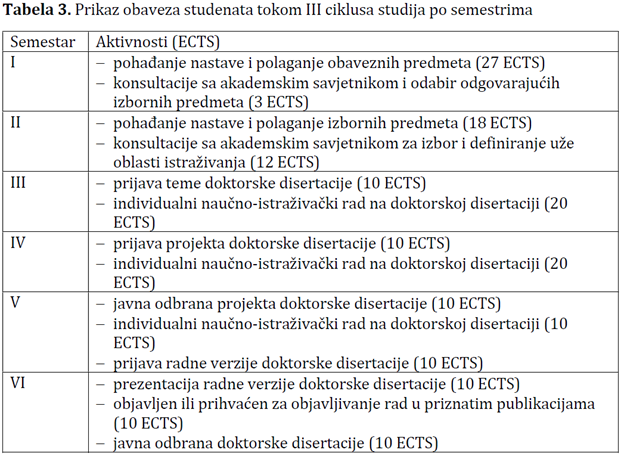 Struktura studijskog programa te obaveze studenata tokom III ciklusa studija, po semestrima, prikazane su u Tabeli 2, odnosno Tabeli 3.